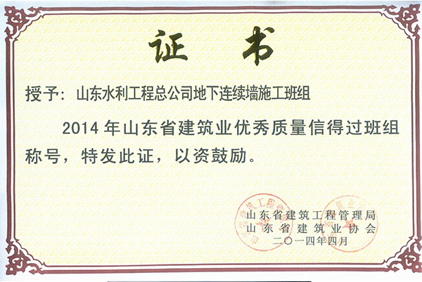 新利·体育·(中国)中国有限公司官网“地下连续墙施工班组”荣获2014年山东省建筑业优秀质量信得过班组称号