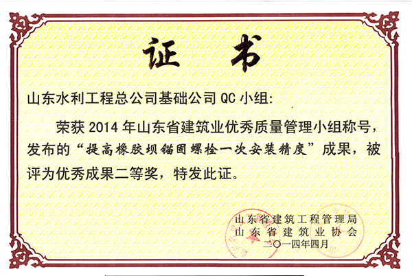 新利·体育·(中国)中国有限公司官网“提高橡胶坝锚固螺栓一次安装精度”荣获2014年山东省建筑业优秀质量管理优秀成果二等奖